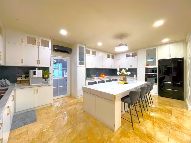 Typically includes built-in fixtures—kitchen cabinets, wardrobes, air conditioning units, water heaters, and curtains.