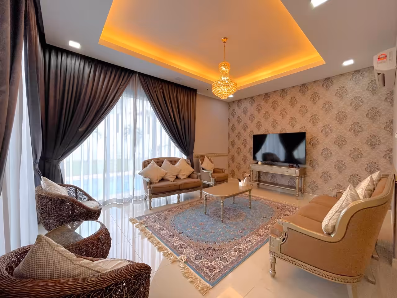 Typically includes built-in fixtures—kitchen cabinets, wardrobes, air conditioning units, water heaters, and curtains.